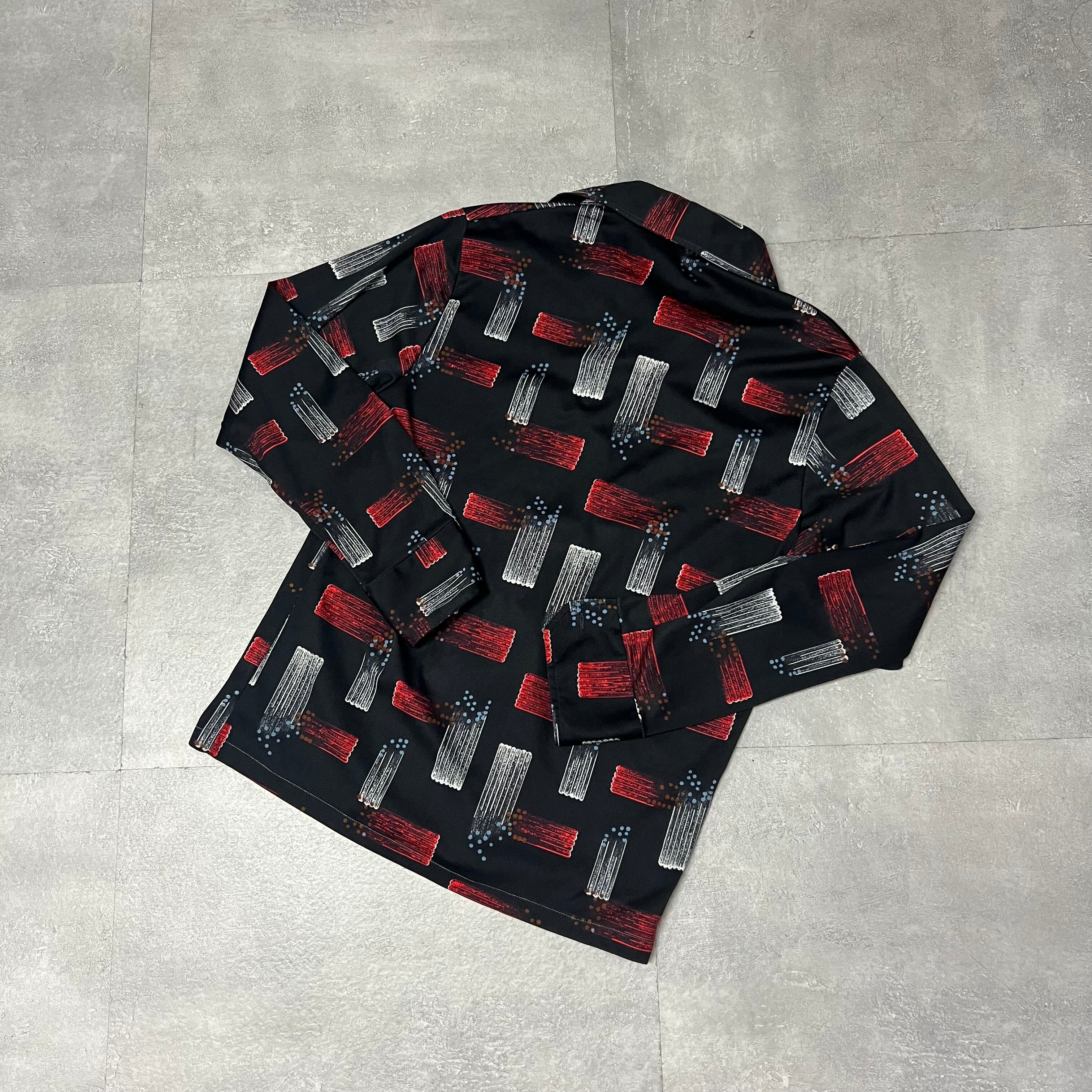 70s総柄デザインポリエステル長袖シャツ黒ブラックアトミック幾何学古着