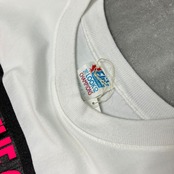 コットン100。シャツ生地のスウェット?なんと言えばいいのだろう。とりあえず生地がシャツと同じ感じでハリがある感じ。配色が80年代特有のネオンカラー的で目をひきます。