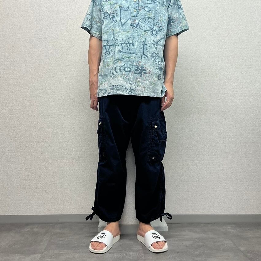 ネイビーのクロップドカーゴパンツでワタリの太さ加減もちょうどいいです。